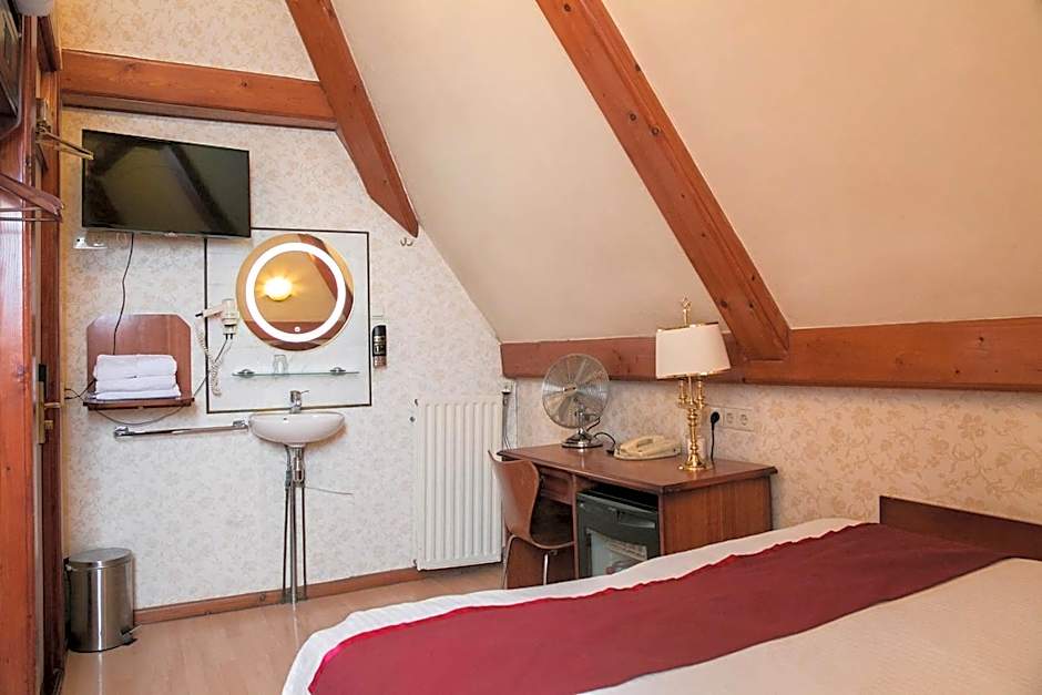 This room includes a mini-bar, TV and a safe. There is a shared bathroom with a toilet and shower in the hallway.